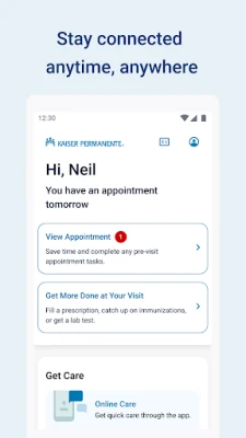 Whether you're at home or on the go, the Kaiser Permanente app gives you a simple, secure way to manage your health — all in one place.