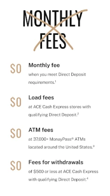 4. Make up to $500 in fee-free cash withdrawals per day from your Porte account by using your debit card at participating ACE Cash Express locations. $500 total is calculated based on all withdrawals performed at all ACE Cash Express locations visited in a day. A direct deposit (no dollar minimum) to the account within the immediately preceding thirty-five (35) days is required. See store for details. Although this feature is available at no additional charge with qualifying direct deposit, certain other transaction fees and costs, terms, and conditions are associated with the use of this Account. Offer subject to change. This optional offer is not a Pathward, N.A., or Visa offer nor does Pathward, N.A., or Visa endorse this offer.